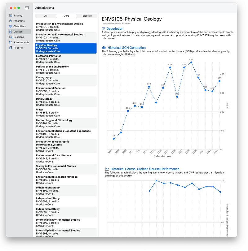 - Temporal tracking of individual classes to include seats, DWF rates, average grades, and scheduling of whose taught it through time.