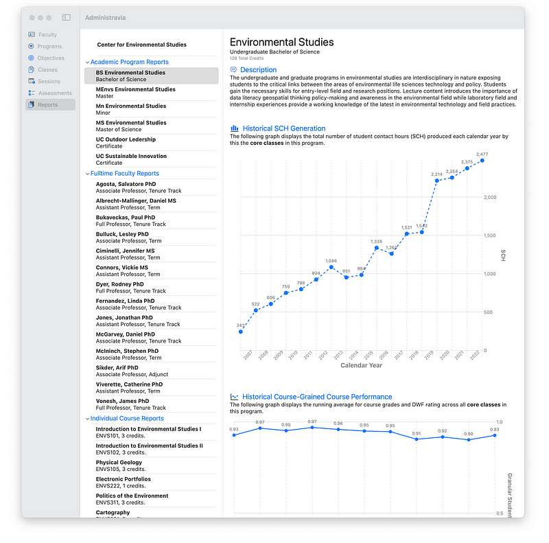 - Report Generation for programs, faculty, and individual courses. This part helps save a tremendous amount of time for chairs and directors since the history of teaching output (quantity and several measures of quality) can be quickly exported as part of the annual review process.