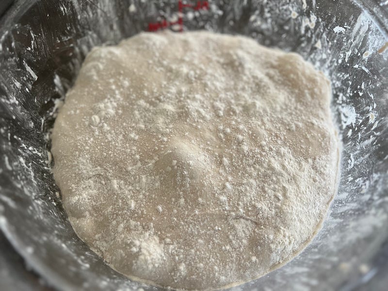 I then let it rest until 2–3pm (if starting at 9), until it is ~4 times as large as you started with. It should look something like this, with all the bubbles on it. I put some flour to prepare bring it out.
