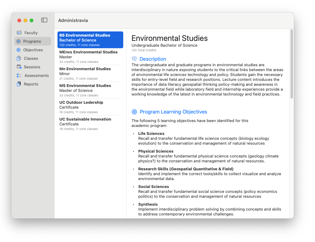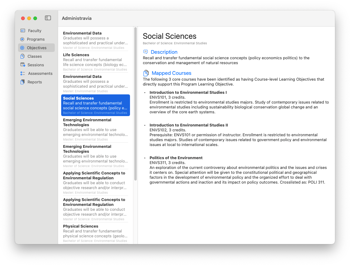 Each academic program is defined by the courses that contribute to it and how these courses are aligned with pre-defined Program Learning Objectives. In fact, every course-level learning objective needs to be mapped directly onto the Program Learning Objectives.