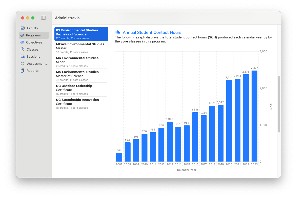 - Annual student contact hours generation for core and elective courses in all programs supported.