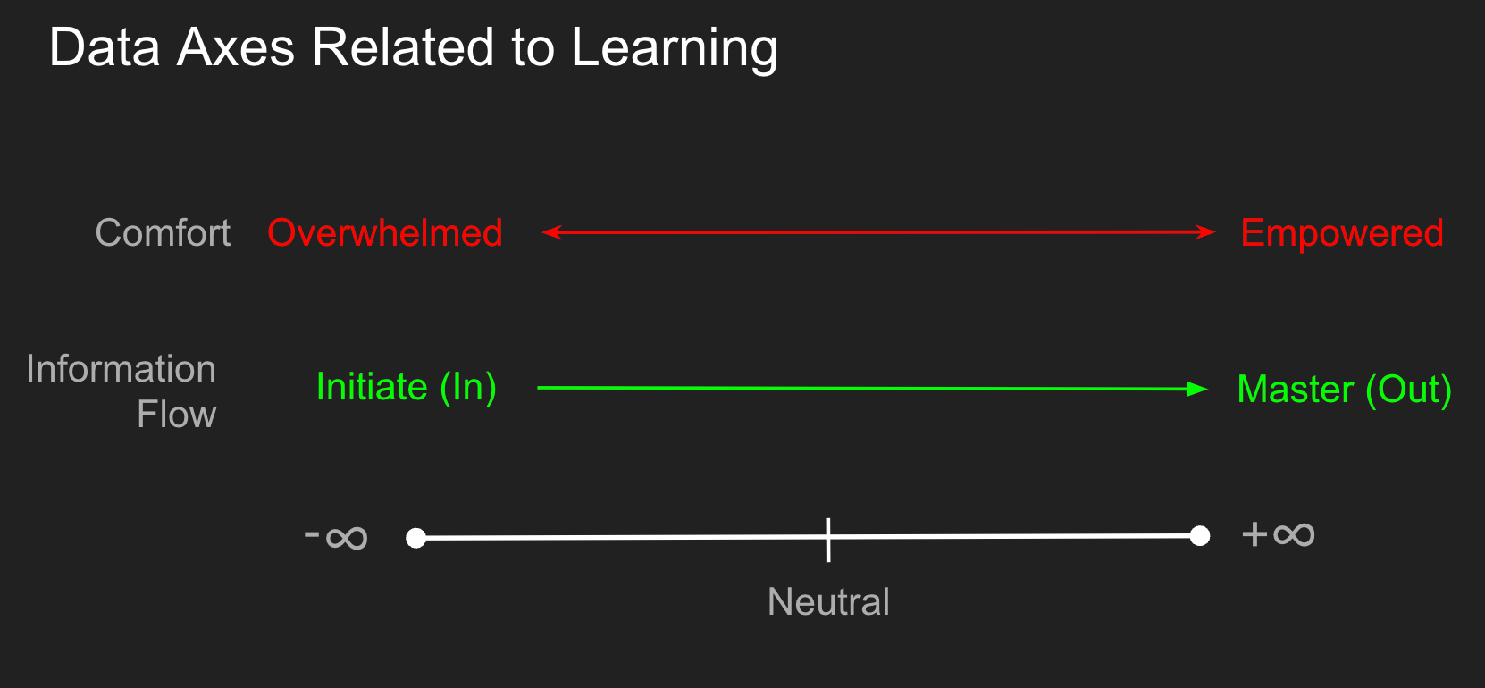 In this simple model, we can combine these orthogonal axes to visualize an individual's temporal progression in this space. As we progress through the learning experience, we intend that individuals will progress "Up and To The Right." If we take the notion that we evaluate before the start of class and after the class is done, then this should be true if we are good educators.