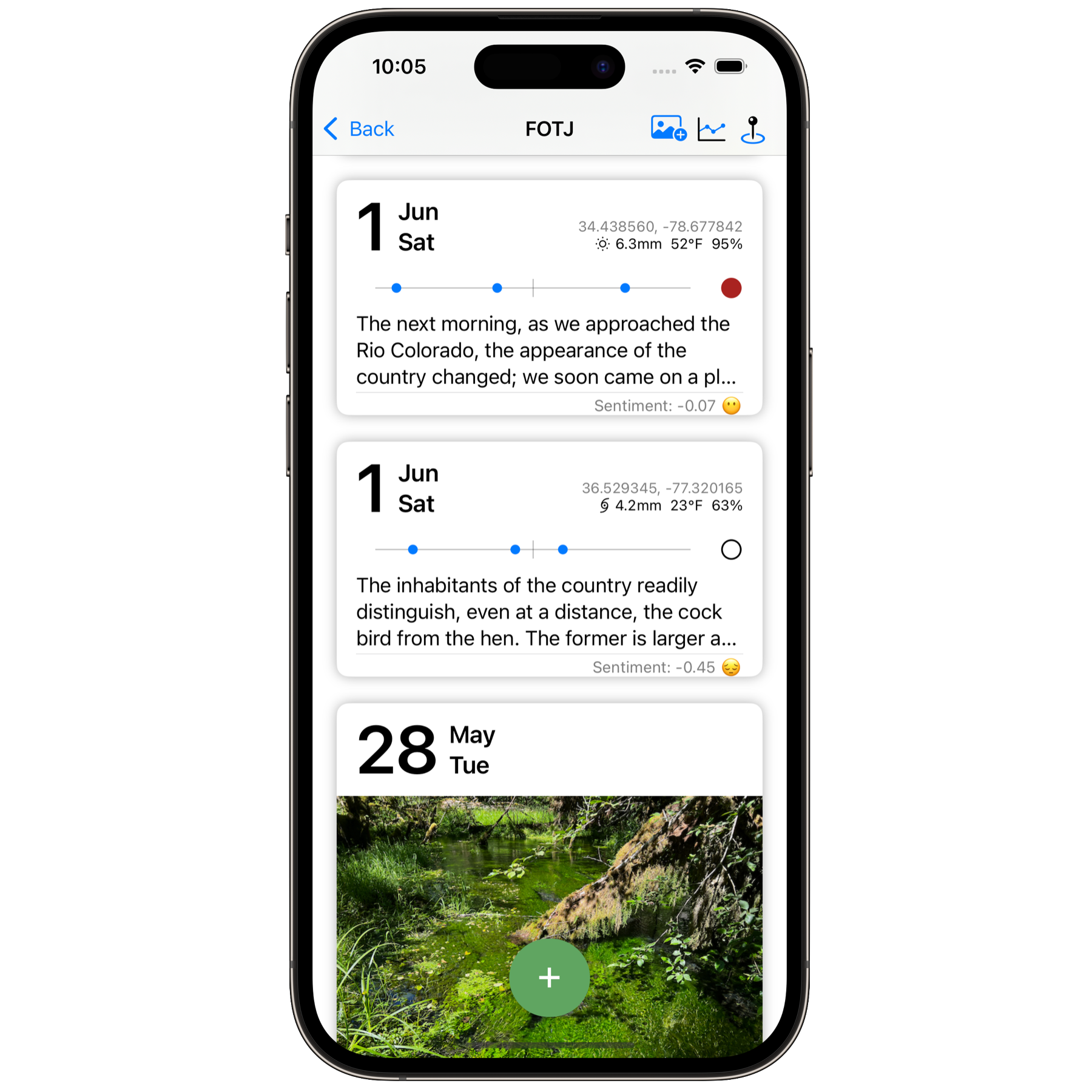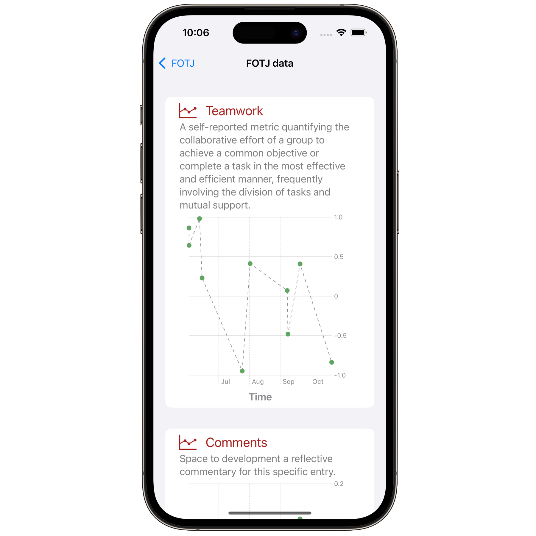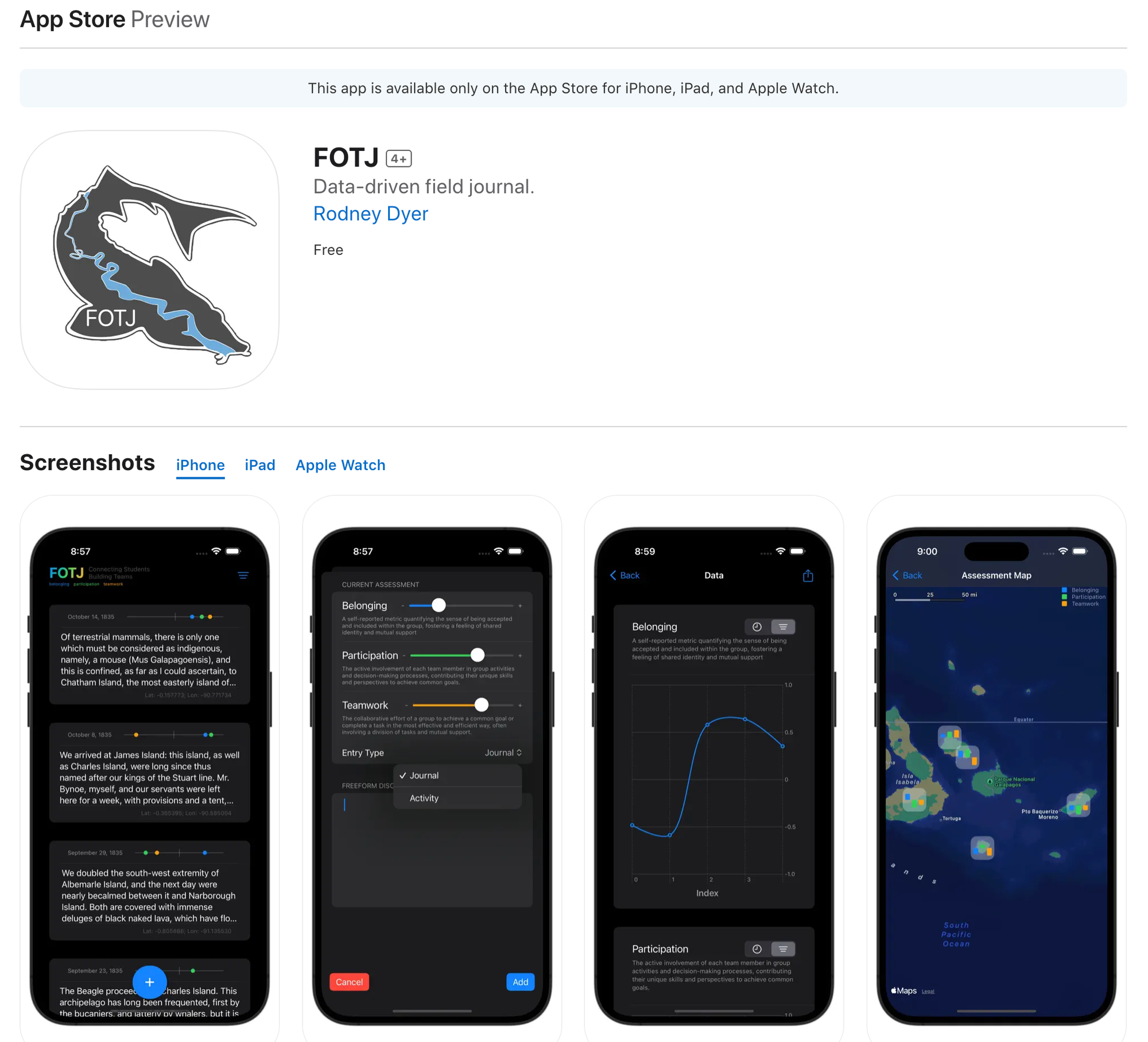 In particular, we were interested in taking quantitative measurements on these axes and providing a system for structured reflection that can incorporate some linguistic analysis. I developed FOTJ (currently in the Apple AppStore and a discussion on my site here), which merged reflective writing and the ability to collect quantitative assessments throughout the expedition.