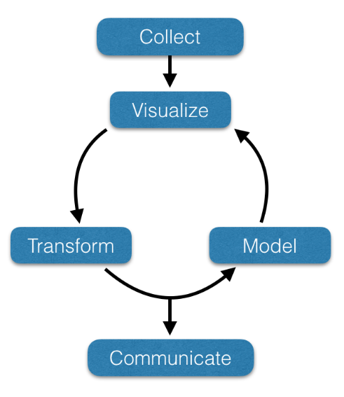 Below is a brief graphical depiction of how analysis works in the real world. In this class, we will work on all of these components using the open-source R language.