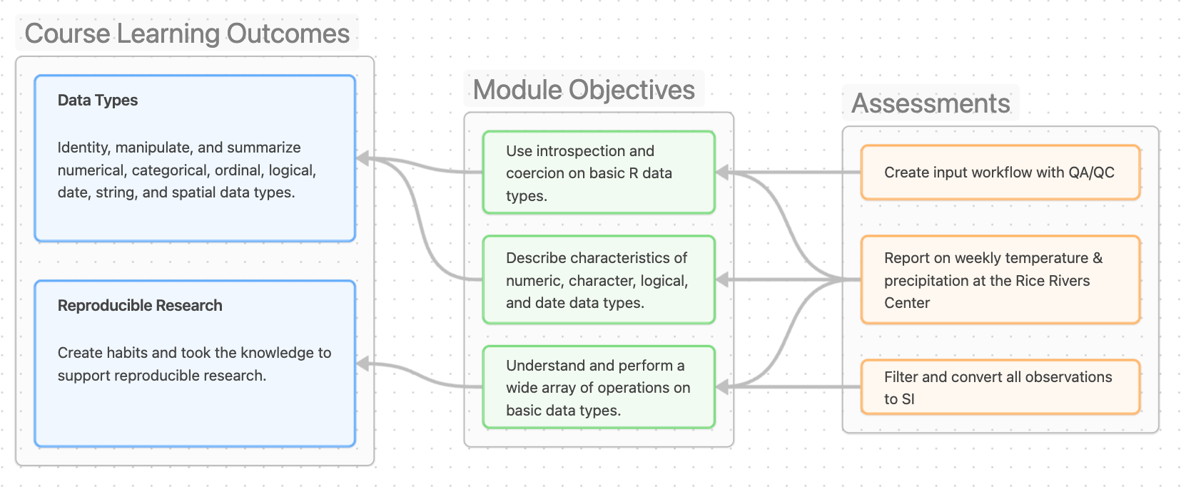 This course is designed as a set of sequential learning modules–each of which builds upon the mastery of previous modules. Every module is self-contained and includes specified learning objectives, supporting learning assets such as a topic narrative, slides, external resources salient to the topic, and a set of assessments so you can demonstrate your mastery of the module's topic. All assessments will have clear objectives and rubrics.